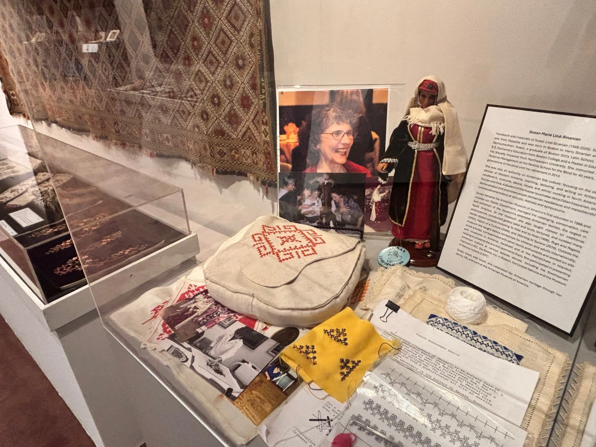 Our first new case honors the late Susan Lind-Sinanian (1948-2025), our Textile Curator, friend, and colleague. Susan's impact on our museum is reflected in this display through her personal items, curatorial contributions, and photographs of her passionate engagement with her Armenian heritage. She was an expert on Armenian folk culture, with strong mastery in embroidery, dance, and cooking. She was a fountain of knowledge and a cornerstone in the Armenian American community, having worked nationally and internationally with other museums and groups to share her vital cultural expertise. This display is on view in our Stitching to Survive exhibition which Susan curated, another illustration of her legacy here at the museum.