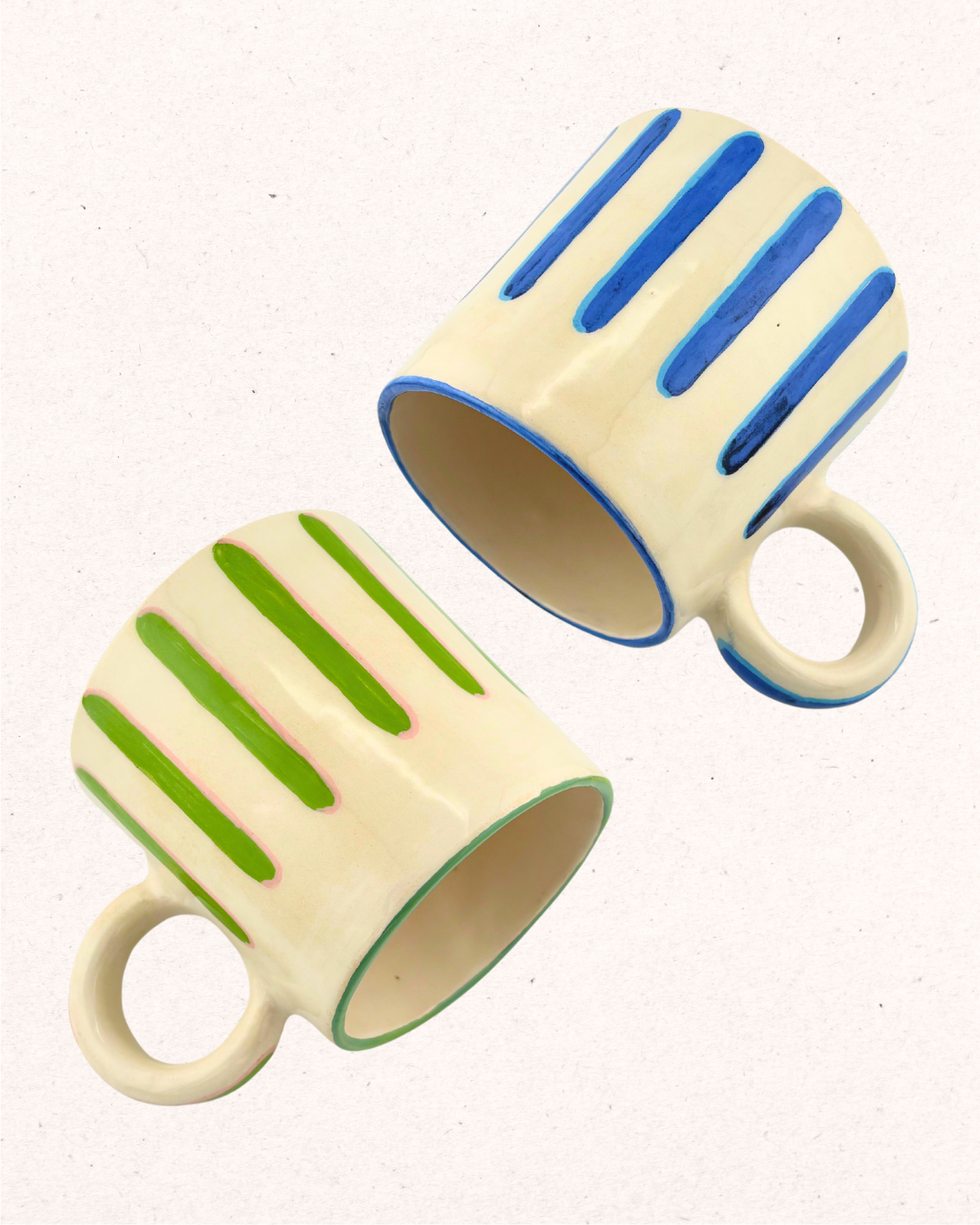 Handmade and meticulously painted by hand, this ceramic mug provides a delightful boost to your mood, as it transforms your daily coffee and tea routines. We designed this mug to mix up what we normally see in tableware—we wanted something that looks misleadingly simple and relaxing to the eye, but with groovy colors and off-beat stripes that give your mind something to nibble on. To realize our vision, we found the most talented group of women, at Niana Art Studio in Yerevan, Armenia, to breathe life into our designs and bring this ceramic mug into your very own hands. Each mug looks simultaneously vintage and modern, as a nod to our past and a tribute to our collective future. We're neither one or the other; we're all things. Yet another collaboration between the diaspora and mother Armenia, brought to you by QAMI JAN.