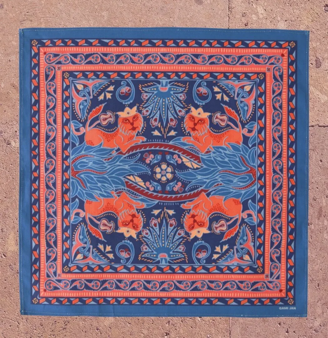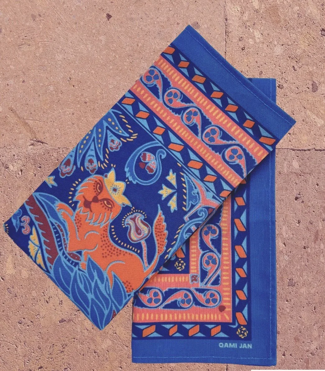 We set out to design cloth napkins that evoke the feeling of enjoying a meal outside, in the Armenian Highlands. "Lucine," meaning moon in Armenian, is the nighttime version of our cloth napkins. QAMI JAN's little lion, a staple of our early designs as adapted from the Sumbatian family's crest, is seen relaxing in the lush forests, as both he and the greenery are illuminated by the light of the moon.